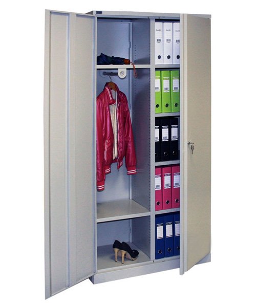 Шкаф поделен на две секции внутренней перегородкой, одна секция предназначена для личных вещей и одежды сотрудников (две полки, перекладина для вешалок), вторая – для документов.