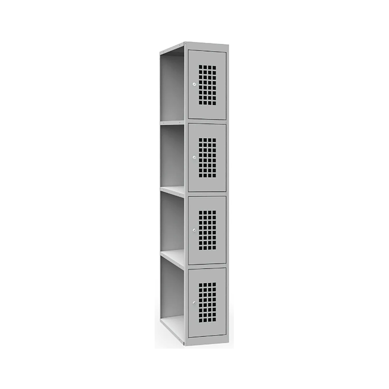 Шкаф с перфорированными дверцами обеспечивает повышенный уровень безопасности, позволяя контролировать наличие и вид оставленных на хранение в ячейках вещей. Это особенно актуально для крупных торговых сетей, где ввиду высокой проходимости принимаются усиленные меры по недопущению террористических угроз. Перфорация на дверях — это 32 квадратных отверстия, имеющих размеры 25х25 мм.