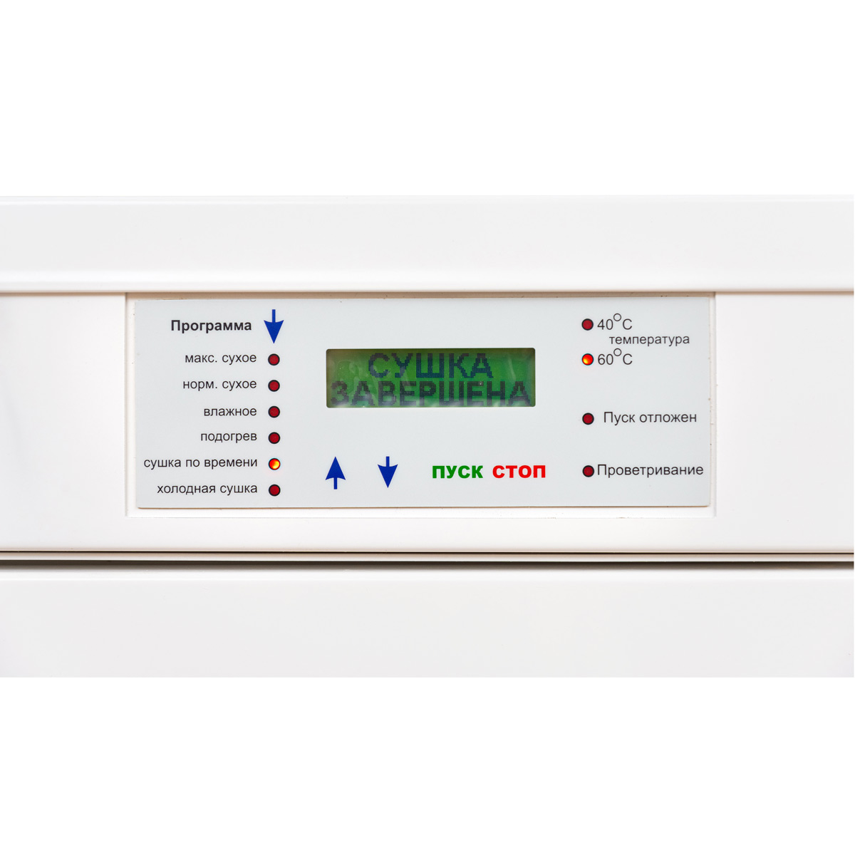 на лицевой стороне крышки шкафа расположены органы управления с кнопками переключения режимов, световой индикацией и жидкокристаллическим дисплеем, показывающим параметры сушки, режимы работы шкафа, а также коды возникающих ошибок;