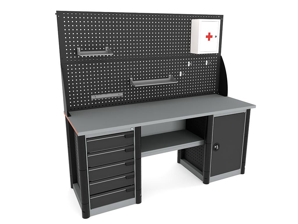 Боковые перфорированные стенки тумбы и опоры позволяют размещать на них различные стандартные аксессуары