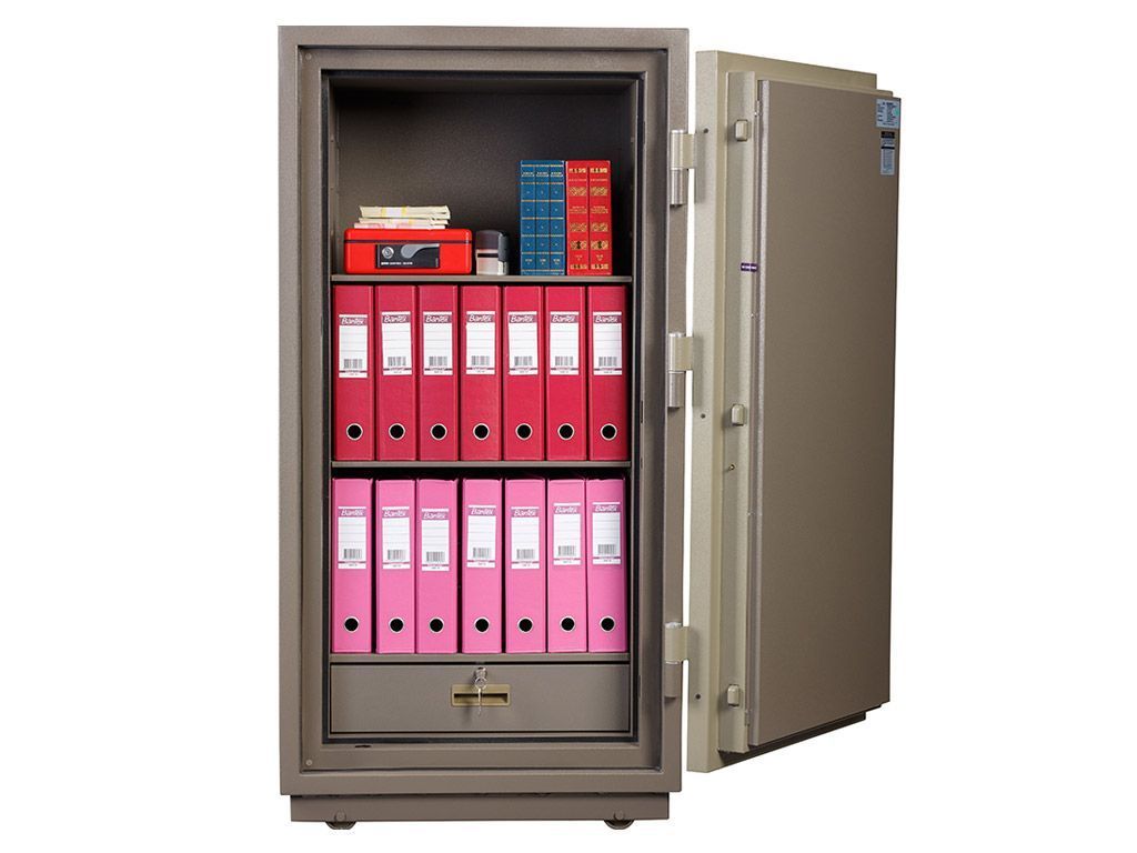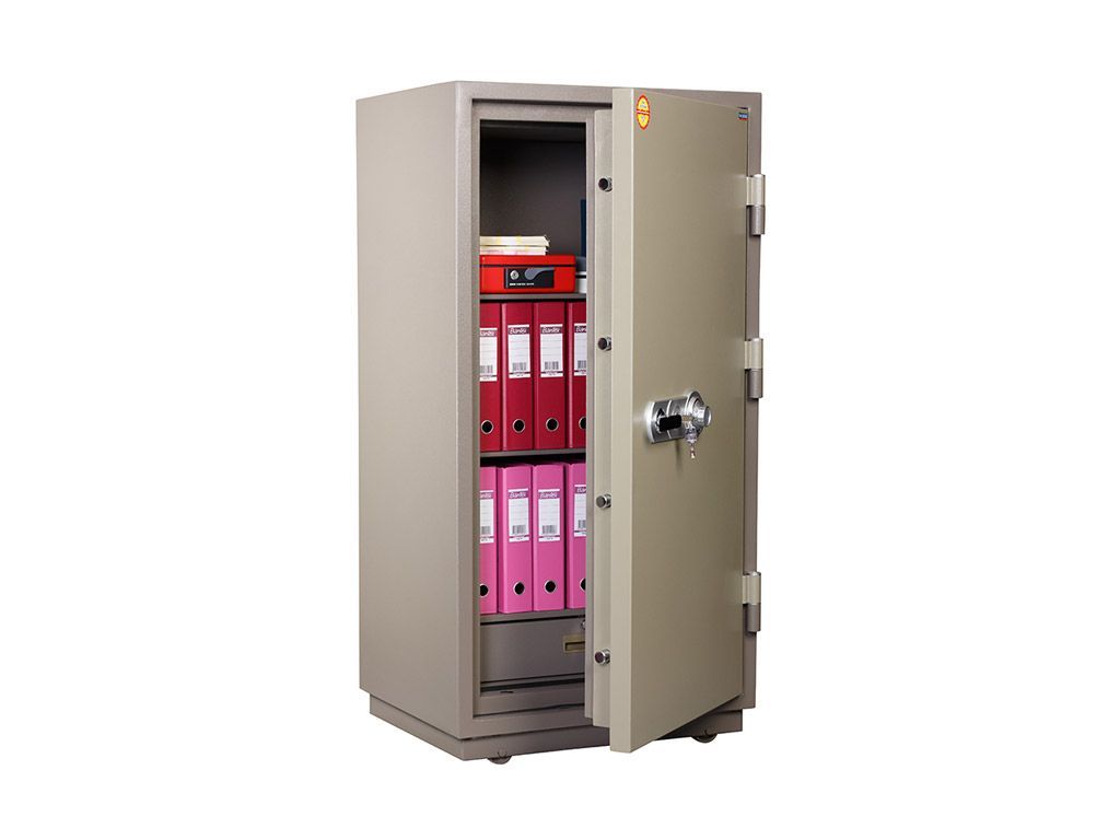 При заливке двери и корпуса сейфа используется запатентованный состав огнестойкого бетона. На сейфах устанавливается тепловой замок, усиленный огнестойким уплотнителем.